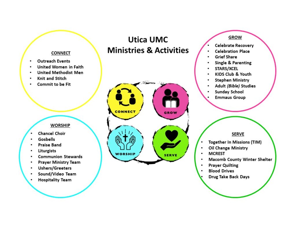 Our ministries and activities are organized into 4 areas – Connect, Worship, Grow, and Serve. These areas offer ways for people to become involved in the life of our church. If you are interested in serving in any of the areas below, please reach out to someone involved in the area or contact the church office for assistance.